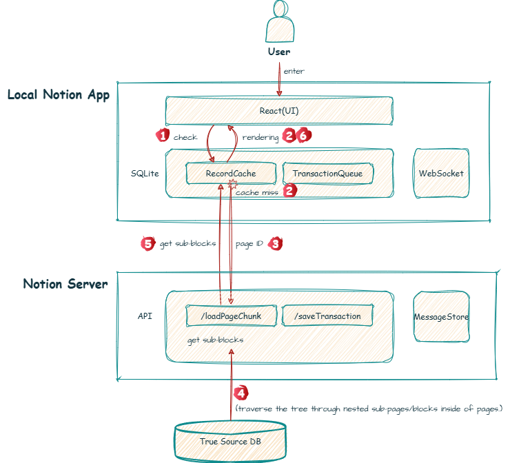 - 트랜잭션은 로컬 상태에 적용되어 메모리와 로컬 캐시(RecordCache)에 저장되고, UI는 재렌더링되어 변경 사항을 화면에 표시합니다. 동시에 트랜잭션은 TransactionQueue에 저장되고, 서버로 API 요청을 통해 전송됩니다.